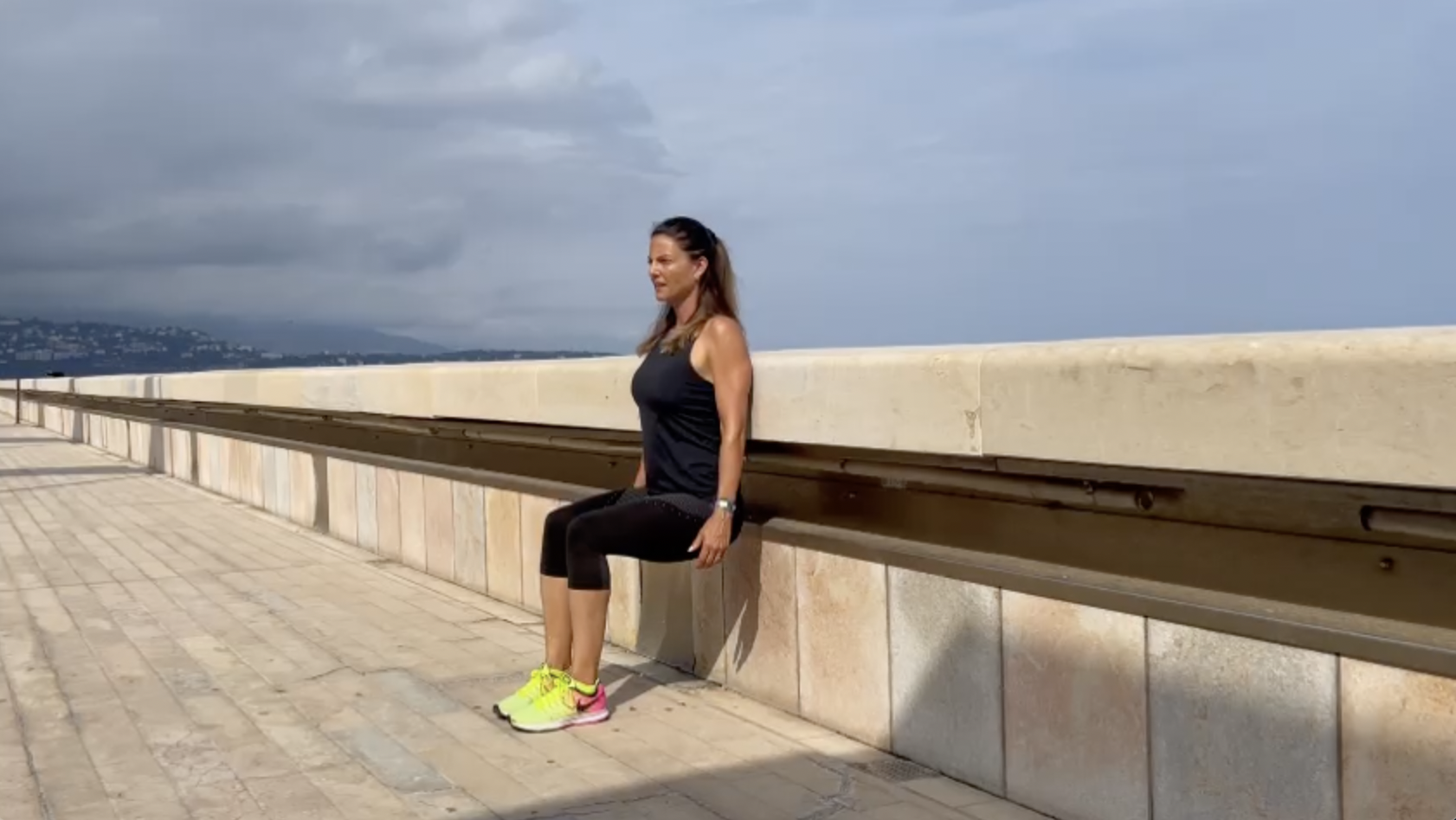 - Wall squat (la chaise adossée à un mur) pendant 40 secondes alterné avec les squats complets avec haltères 5 x 10 répétitions en tempo 2/2 (45 secondes de repos entre chaque série)